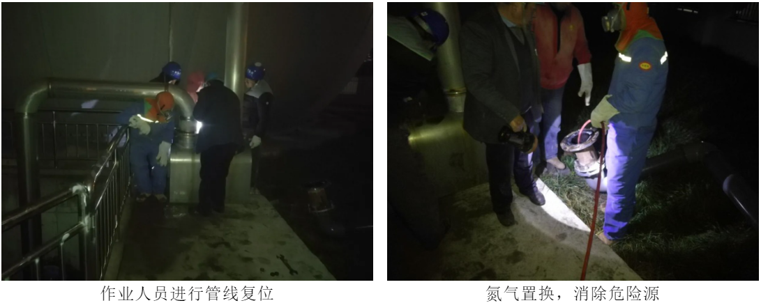 在安全技术管理方面,针对动火作业以及抽堵盲板作业,严格执行危险作业票审批规范,严格遵守安全操作规程,做到先通风,再检测,后作业。具体对已进入投产阶段的一期厌氧系统临时停运,且对需切割或施焊的管线利用氮气进行气体置换直至检测合格;同时,对作业周边环境气体进行检测,两方面均已检测合格且在管理人员确认条件具备后方可开始作业。